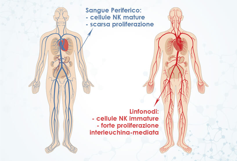 La maggior parte di quelle in circolo nel sangue è costituita da cellule mature in grado di uccidere direttamente i loro bersagli ma con una scarsa capacità di proliferare; viceversa, nei linfonodi sono presenti cellule NK meno mature ma con un’elevatissima capacità di proliferare in presenza di specifici mediatori chimici (le interleuchine).