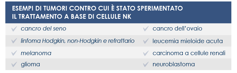 Diversi studi hanno dimostrato fattibilità e sicurezza delle terapie basate sull’utilizzo delle cellule NK. Un esempio, tra i nuovi approcci in immuno-oncologia, è rappresentato dall’uso di cellule NK aploidentiche (derivate da consanguineo anche non perfettamente compatibile: genitore, figlio, fratello o cugino) o autologhe (del soggetto da cui sono state prelevate, ad esempio, alla nascita), abbinato a terapie farmacologiche mirate a sensibilizzare le cellule tumorali agli immunociti (cellule del sistema immunitario).