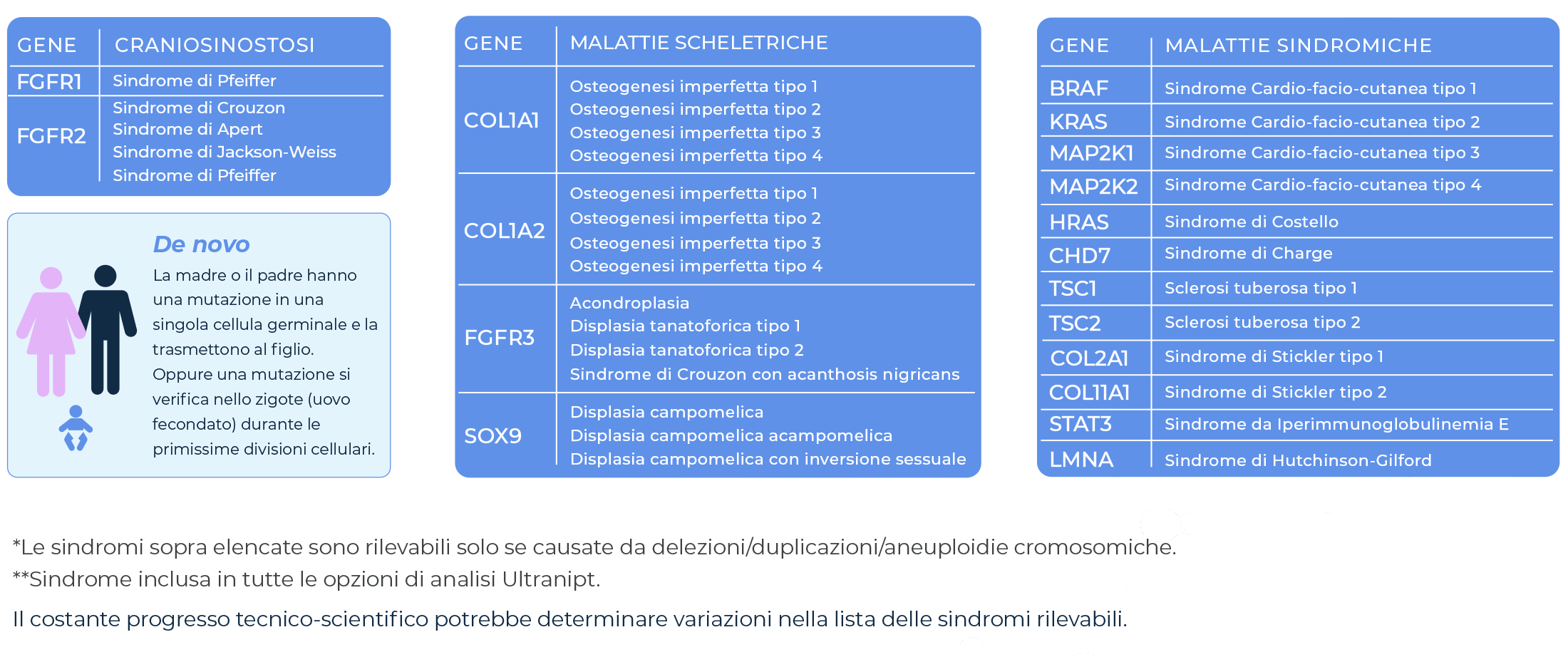 L’utilità clinica di ULTRANIPT migliora grazie alla rielaborazione di tutte le sindromi da delezione/duplicazione incluse nel test. Le sindromi, che passano da 84 a 92, sono state selezionate includendo solo quelle che causano malattie gravi, con un quadro clinico chiaro e documentato in letteratura (presenza di casi clinici e/o citazioni nei database internazionali per le malattie genetiche).