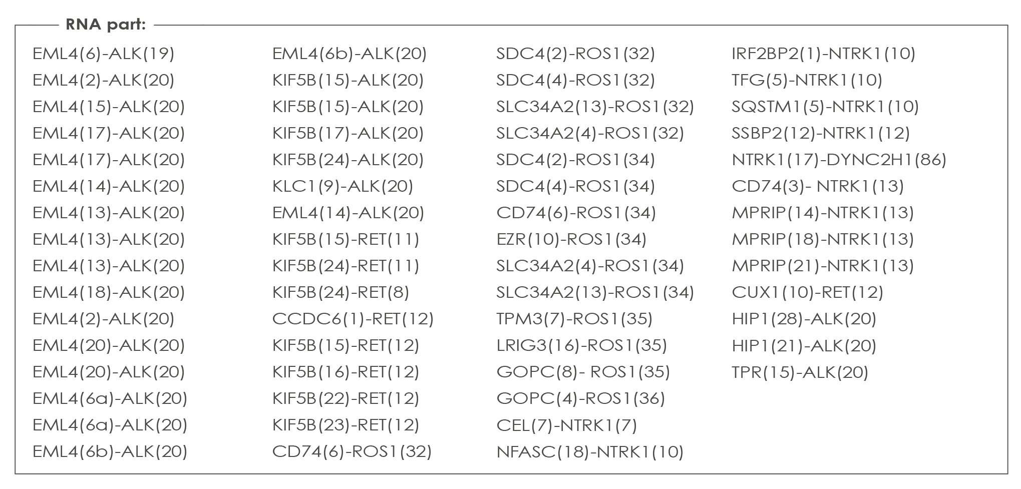 a versatile solution covering all clinically relevant mutations and Gene Fusions. Including variants in KRAS, NRAS, BRAF, HER2 as well as gene fusions for ALK, ROS1, RET and NTRK1 plus other genes of the Oncomine Solid™ - CE-IVD. The Oncomine Solid Tumour kits are CE-IVD kits for both DNA and RNA workflows. This assay is compatible with formalin-fixed and paraffin-embedded (FFPE) highly degraded samples. List of genes analyzed with the Lung Cancers Assay: