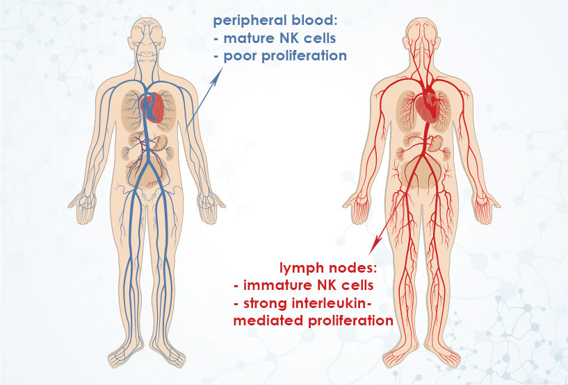 Most of NK cells in the blood are mature cells able to kill their targets but characterized by scarce proliferation. On the contrary, NK cells in lymph nodes are less mature but can proliferate more in the presence of specific molecules (the so-called interleukins).