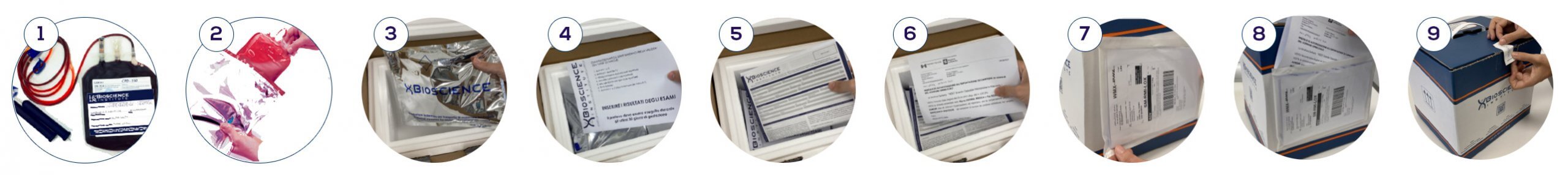 Immediately after delivery, the umbilical cord is cut and, in the portion still connected to the placenta, the needle of the collection bag is inserted. The cord blood runs by gravity inside the bag which, once filled, is inserted into the isothermal container and then into the waterproof case for transport. The procedure to collect the Kit at the birth point is activated by contacting Bioscience Institute directly.