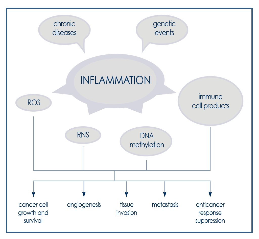 The link between inflammation and tumors depends on two different phenomena. On the one hand, genes involved in the development of cancer can stimulate inflammatory processes. On the other hand, inflammation increases the risk of cancer by suppressing antitumor immune responses and creating conditions that favor the accumulation of mutations, the growth and survival of tumor cells, the formation of blood vessels that nourish the tumor, the ability of tumor mass to invade surrounding tissues and to stimulate metastases.