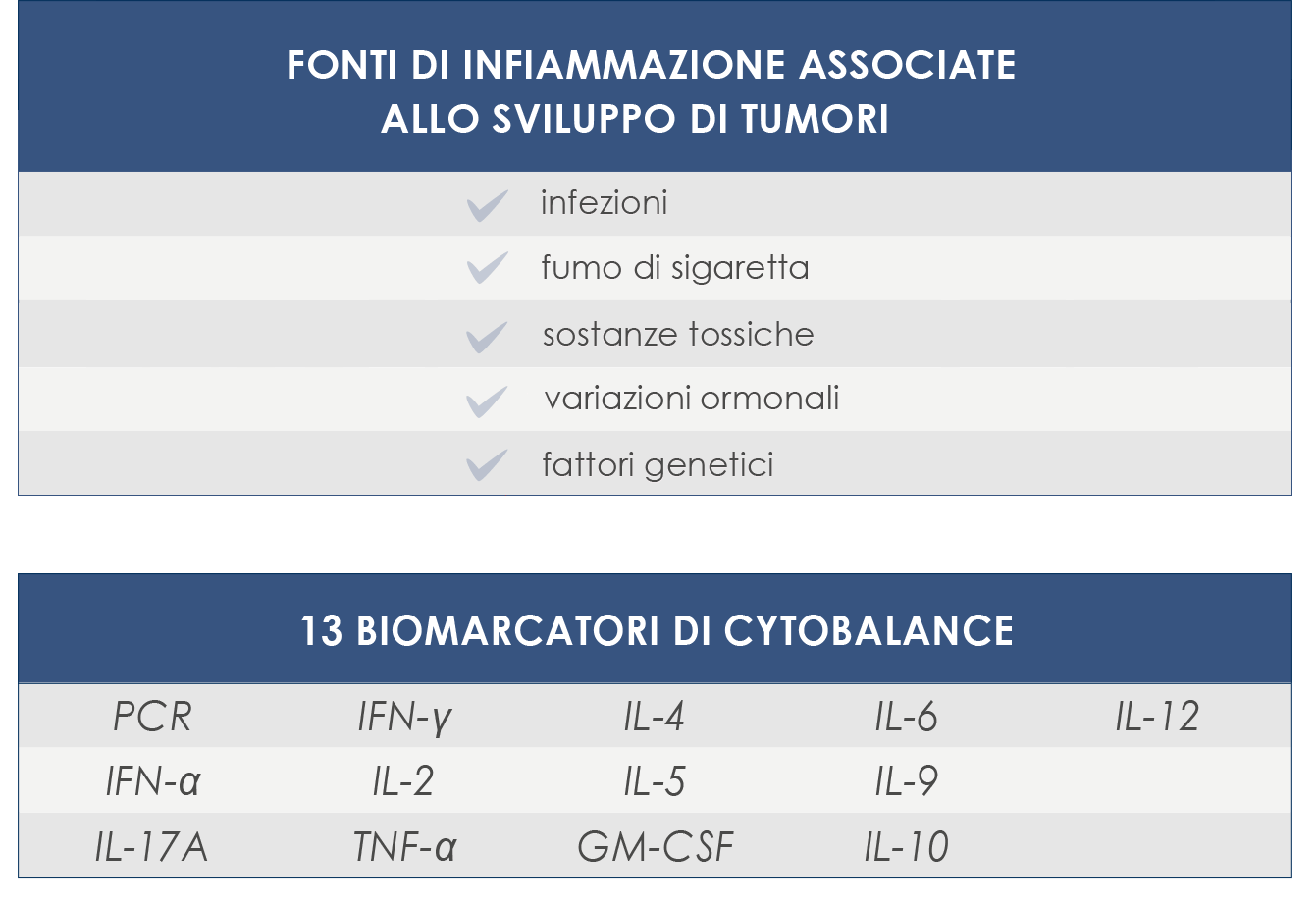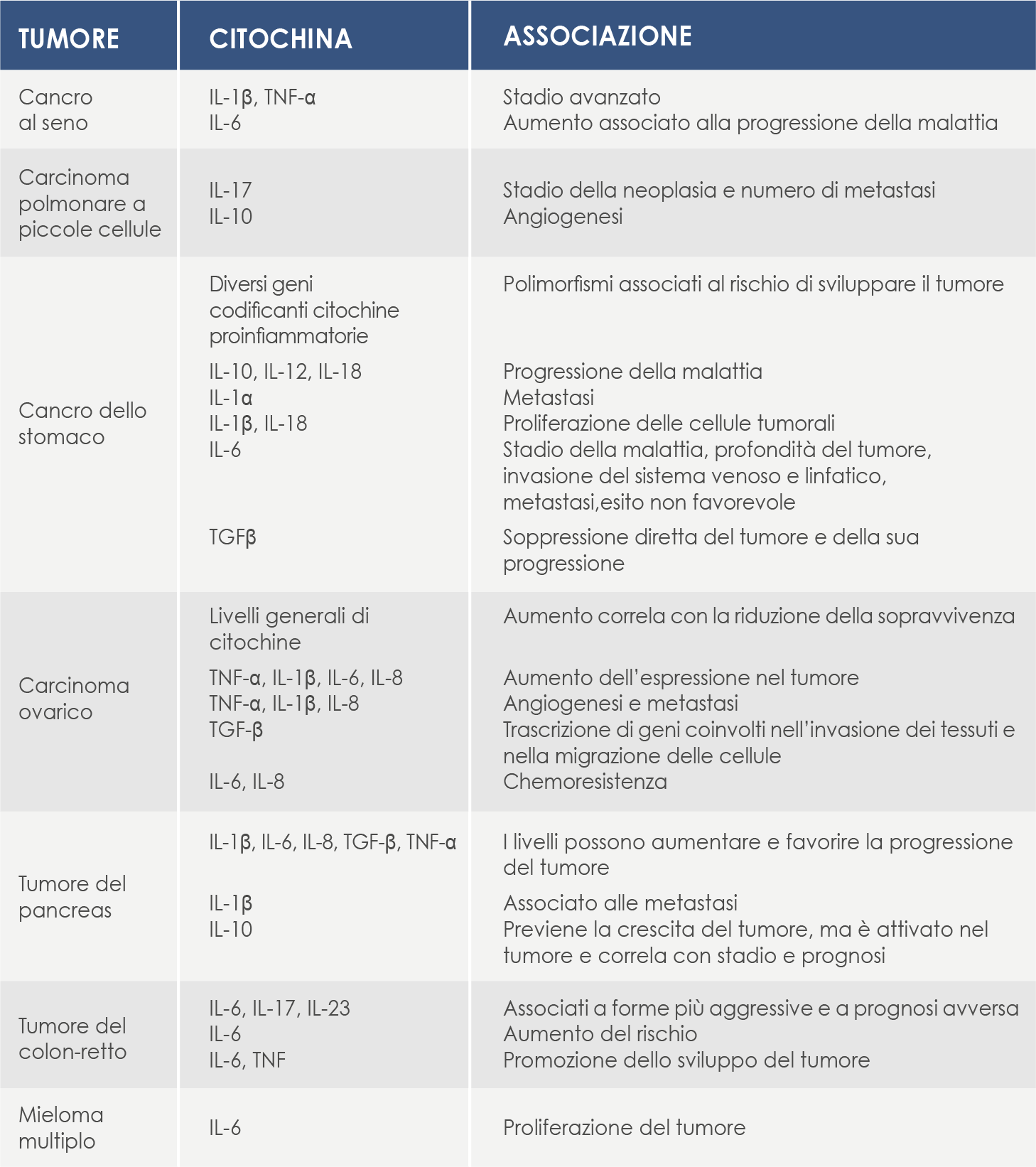 Diverse molecole associate all’infiammazione sono associate anche ai tumori. In particolare, sia le cellule tumorali sia quelle che circondano il tumore producono citochine proinfiammatorie come il Tumor Necrosis Factor α (TNF-α), una molecola sintetizzata nelle fasi iniziali della risposta infiammatoria che gioca un ruolo fondamentale anche nel mantenimento dell’infiammazione. Il TNF-α è coinvolto nei meccanismi che regolano la crescita di tumori e la loro capacità di invadere i tessuti e produrre metastasi.